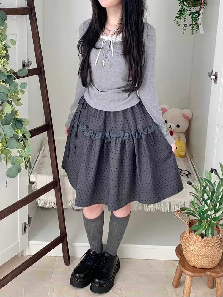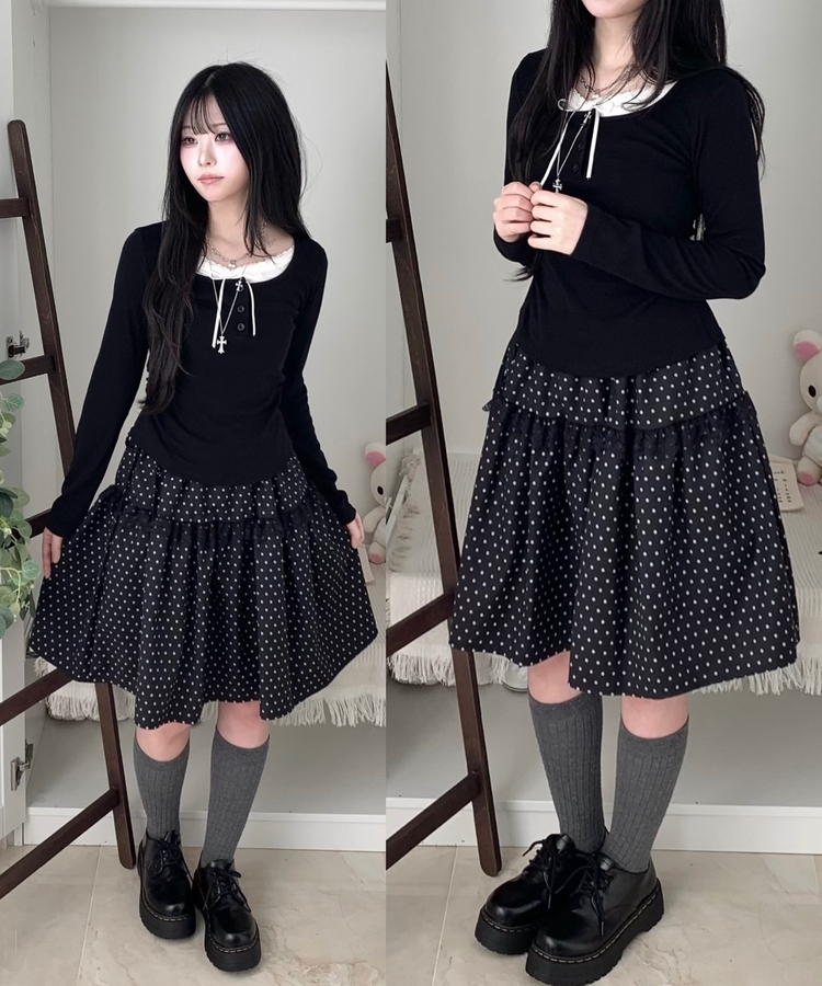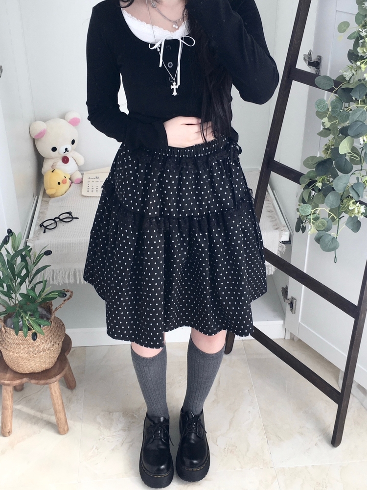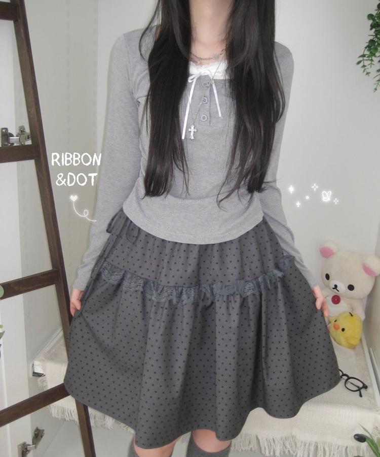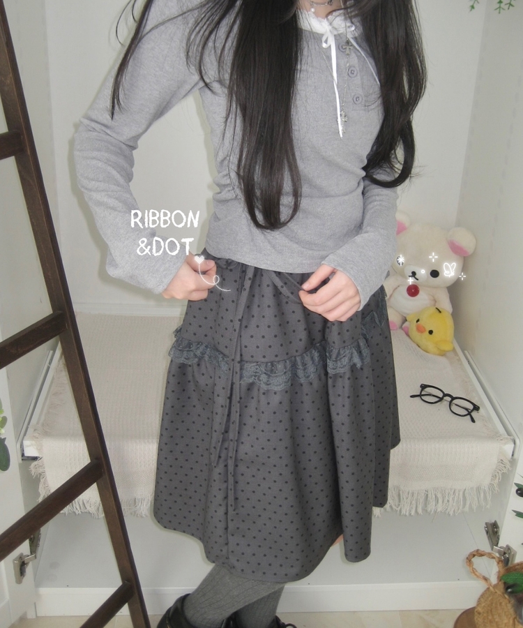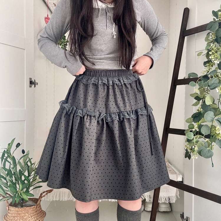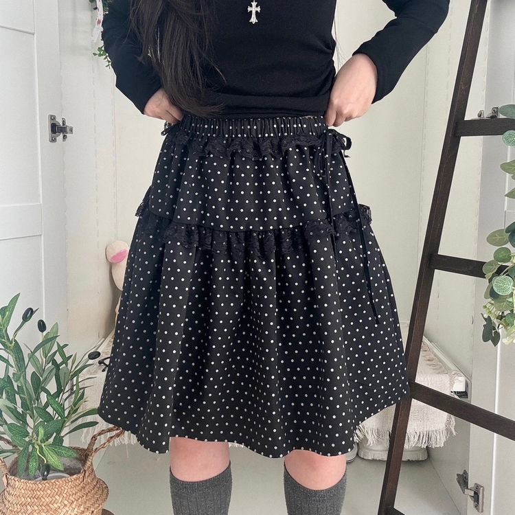 SSK26259 무채색 도트 사이드리본 밴딩 레이스 캉캉 미디 스커트 봄 여름 가을 겨울 하객 개강 일