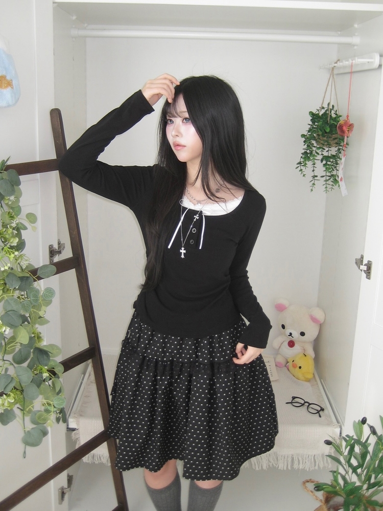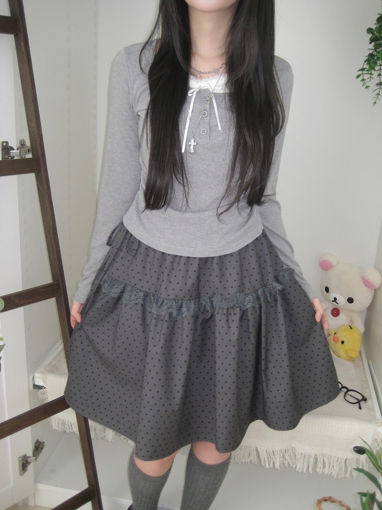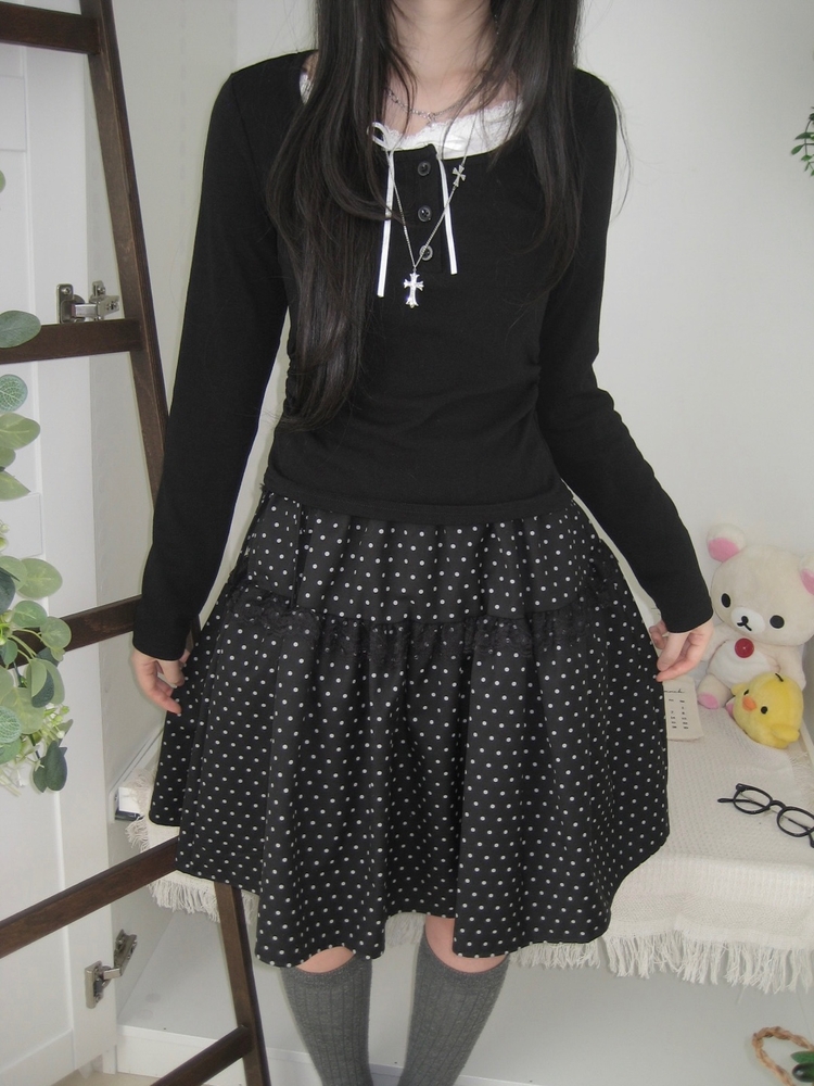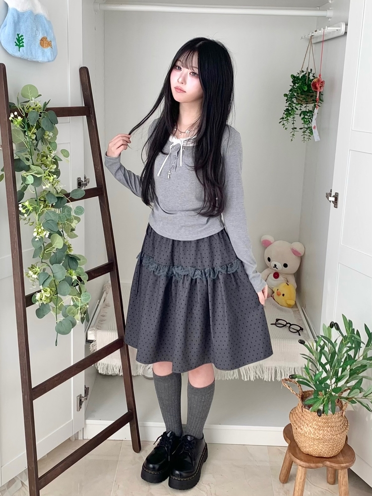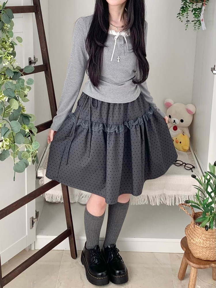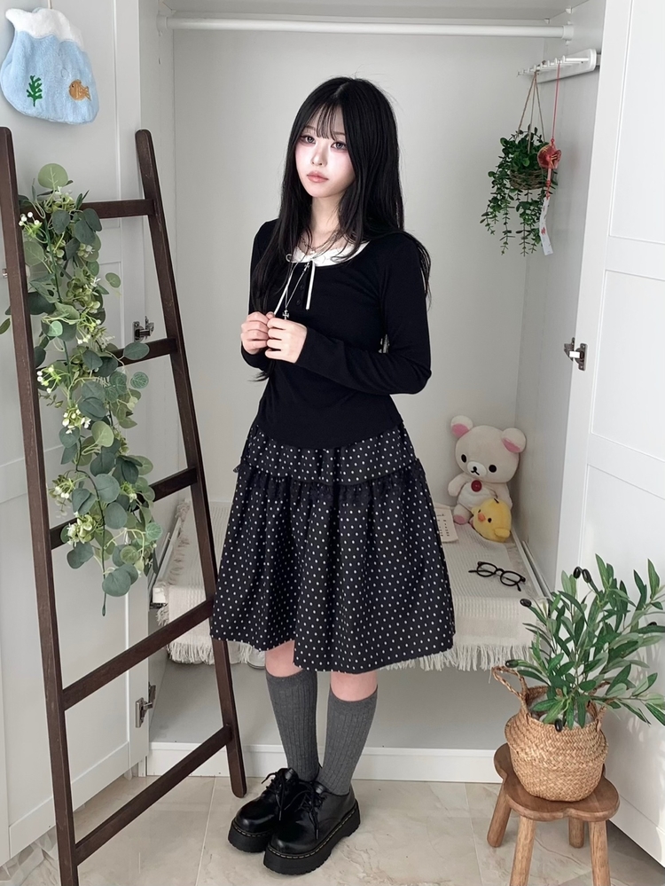 SSK26259 무채색 도트 사이드리본 밴딩 레이스 캉캉 미디 스커트 봄 여름 가을 겨울 하객 개강 일