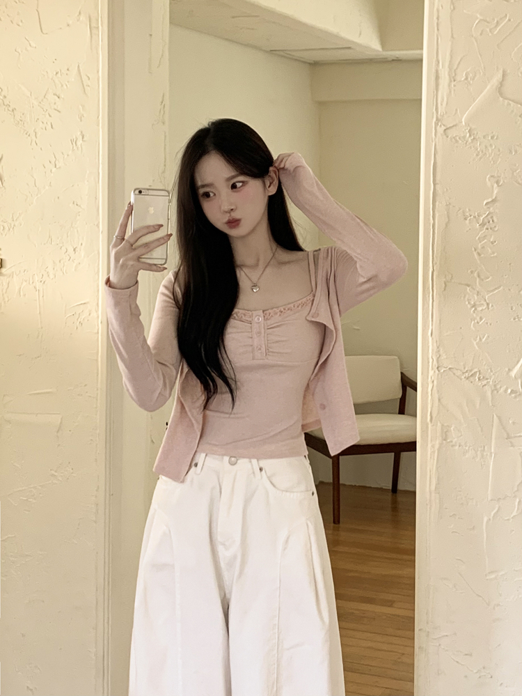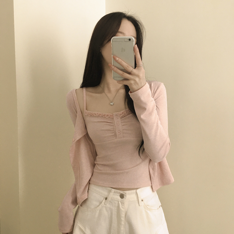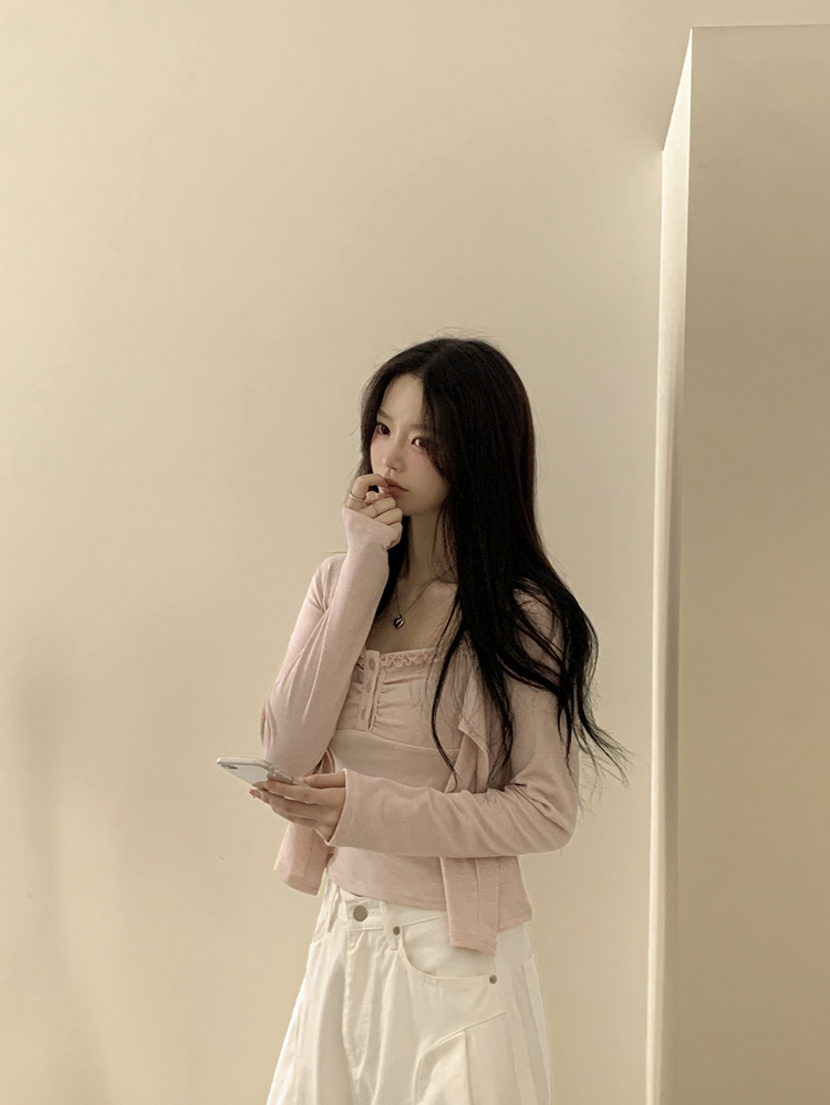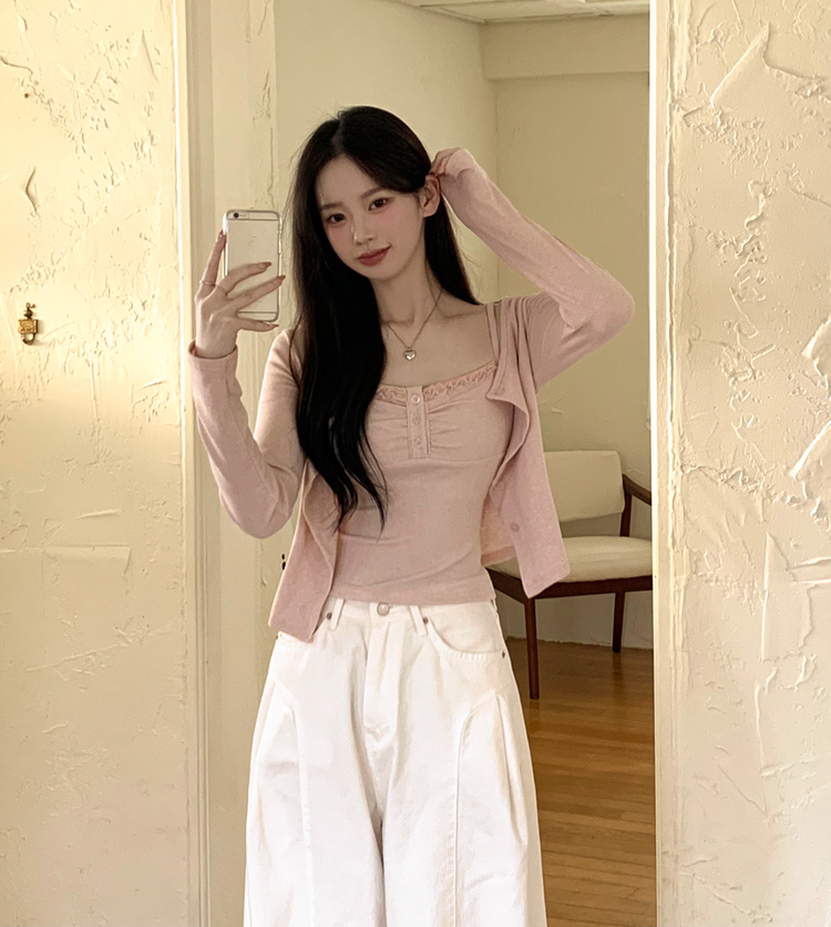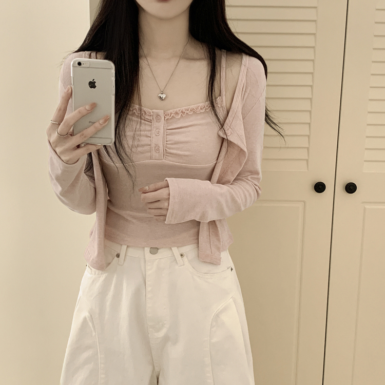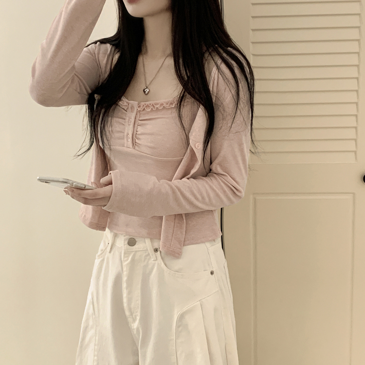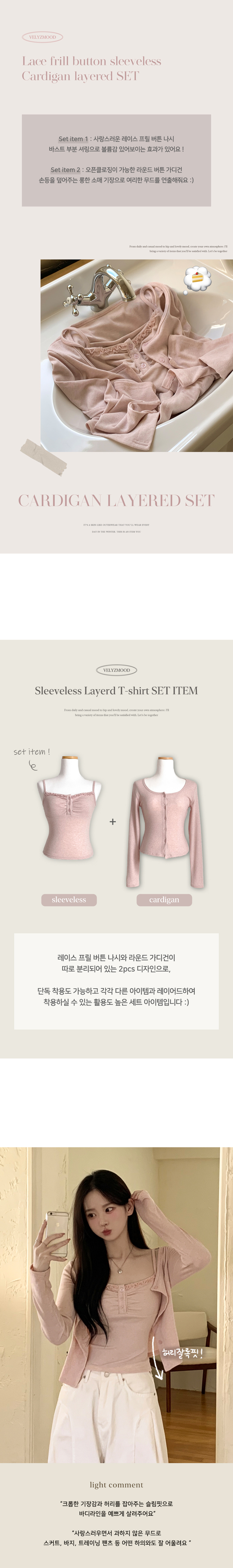 SGD31485 청순벚꽃룩 레이스 프릴 버튼 셔링 크롭 나시 크롭 핑크 가디건 레이어드 세트