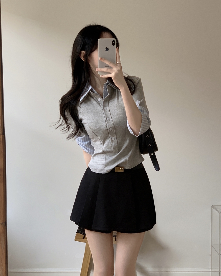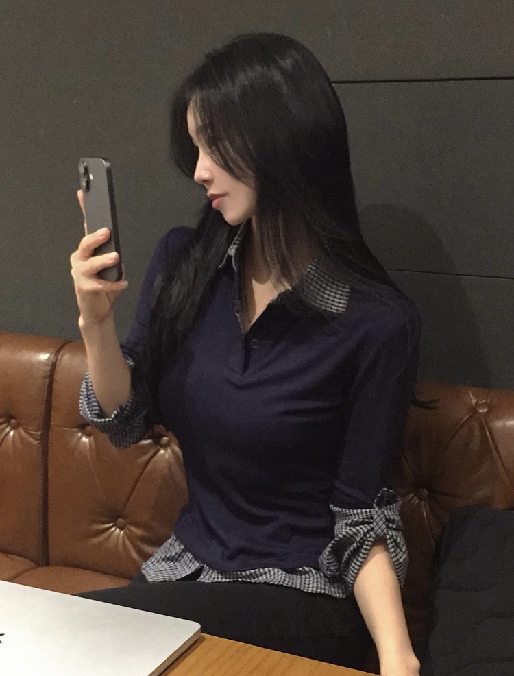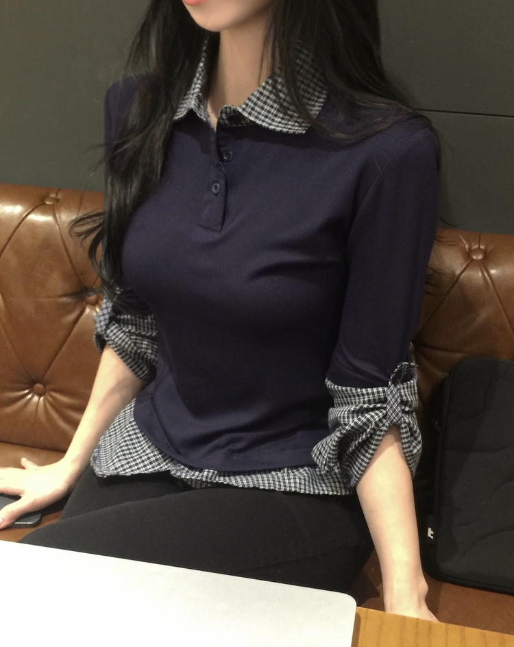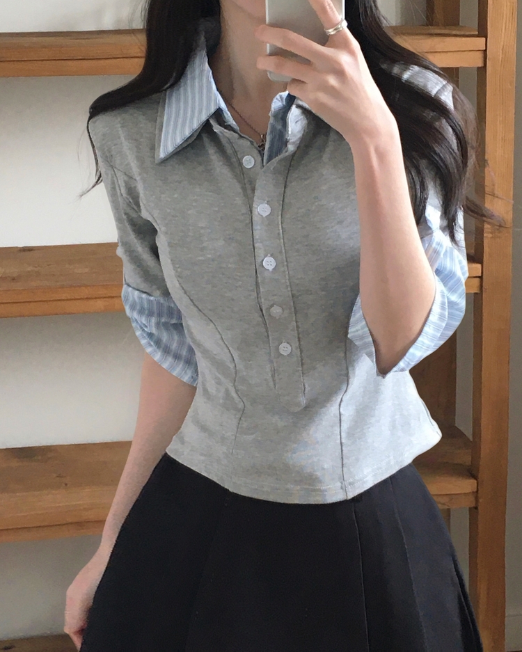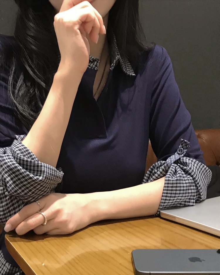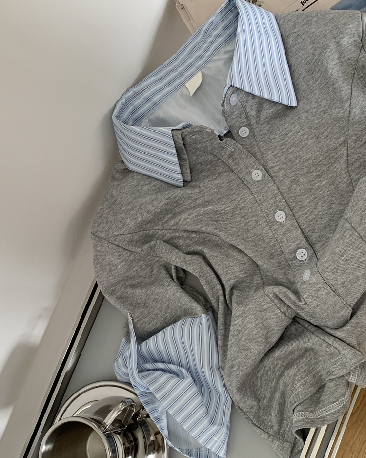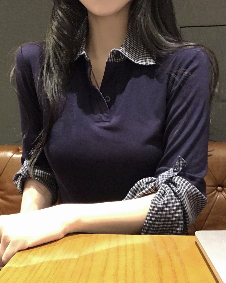 STS244062 일체형 체크 버튼 레이어드 카라 긴팔티셔츠 2color