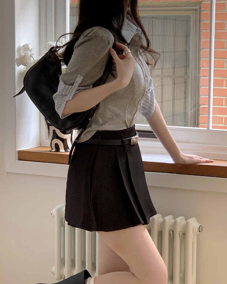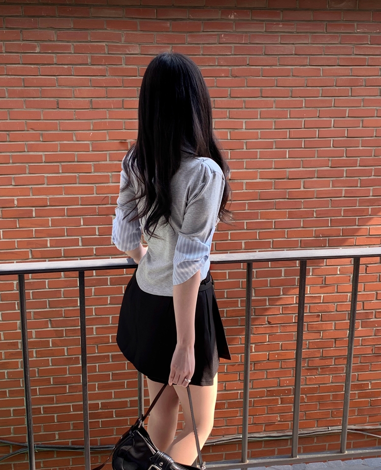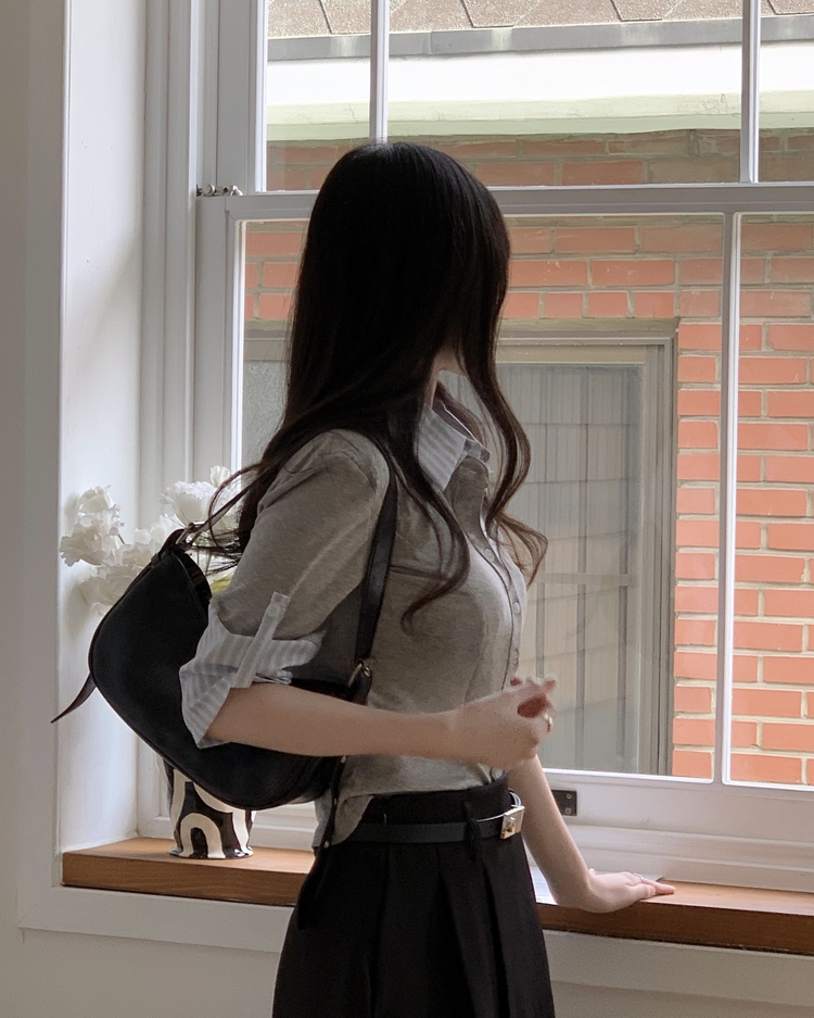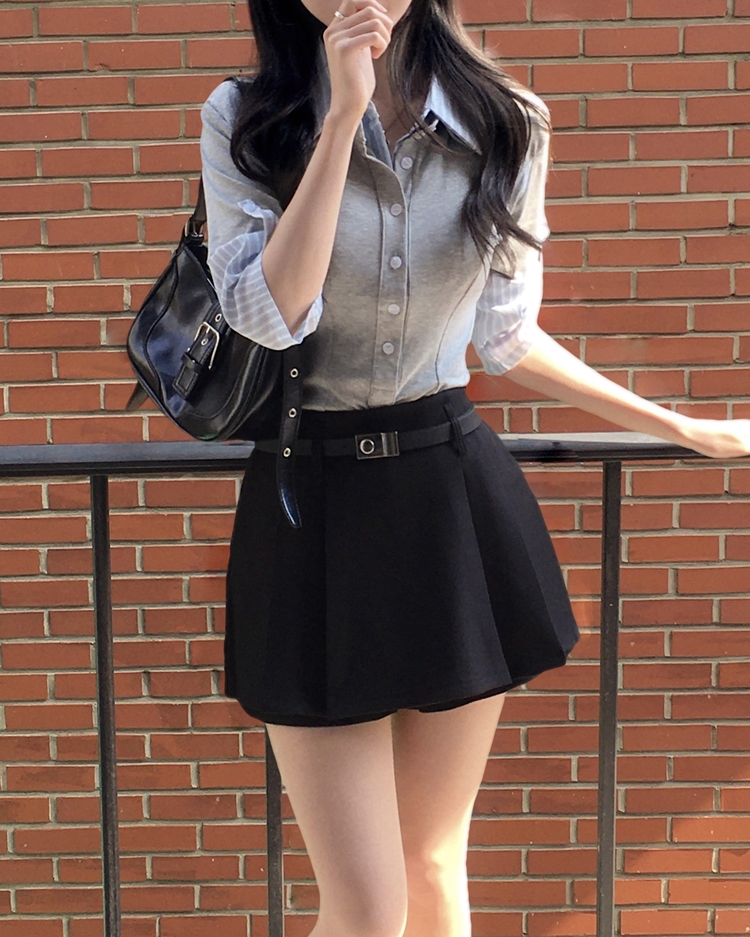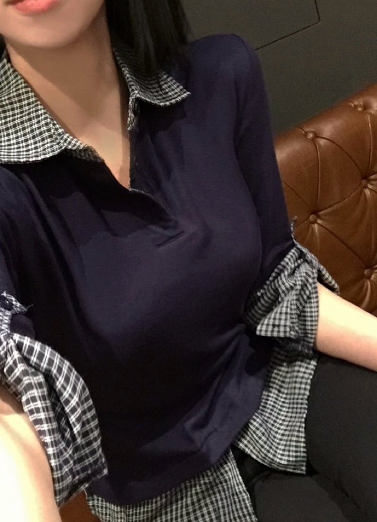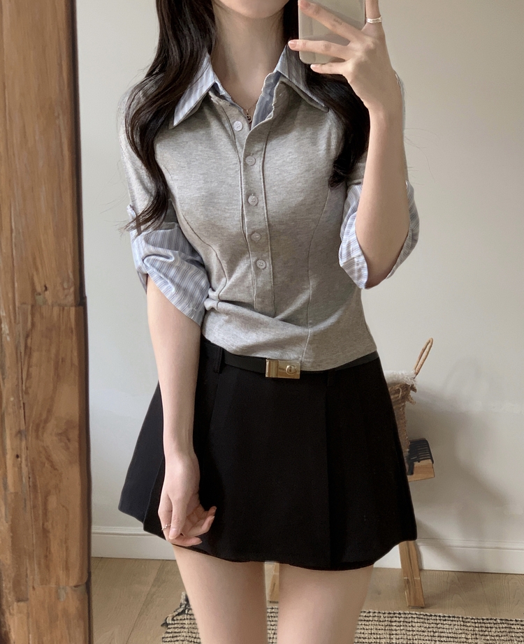 STS244062 일체형 체크 버튼 레이어드 카라 긴팔티셔츠 2color