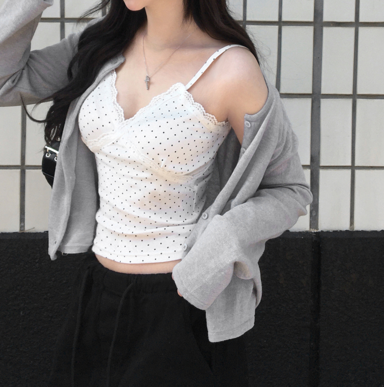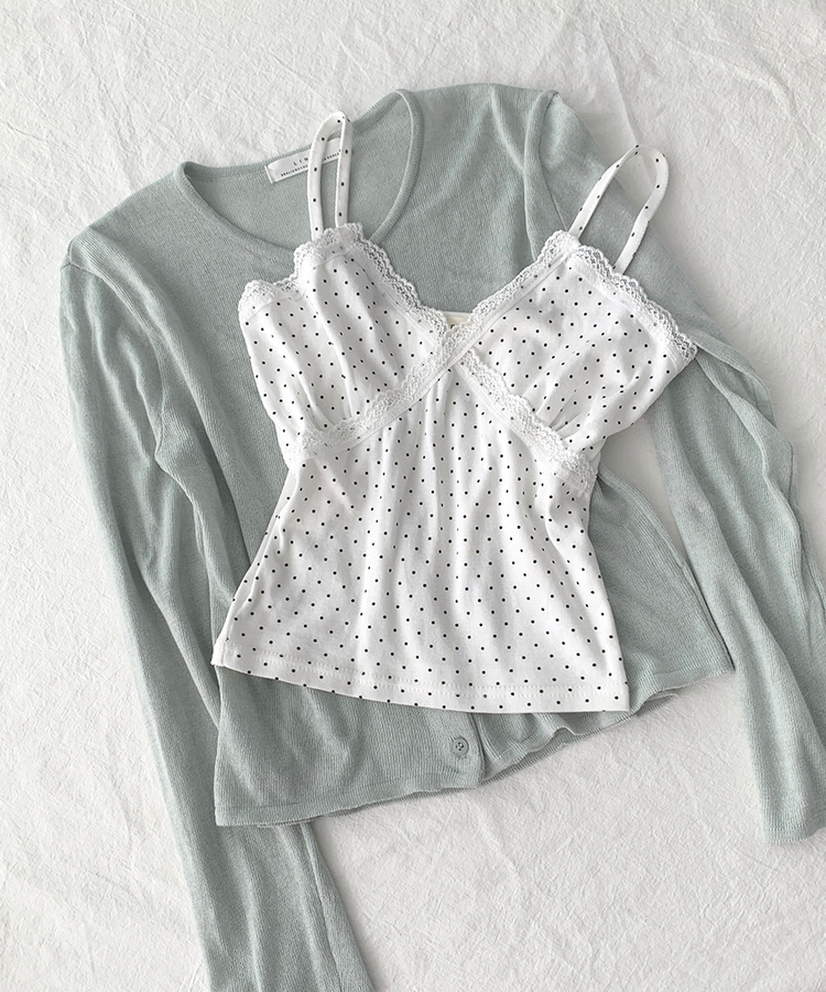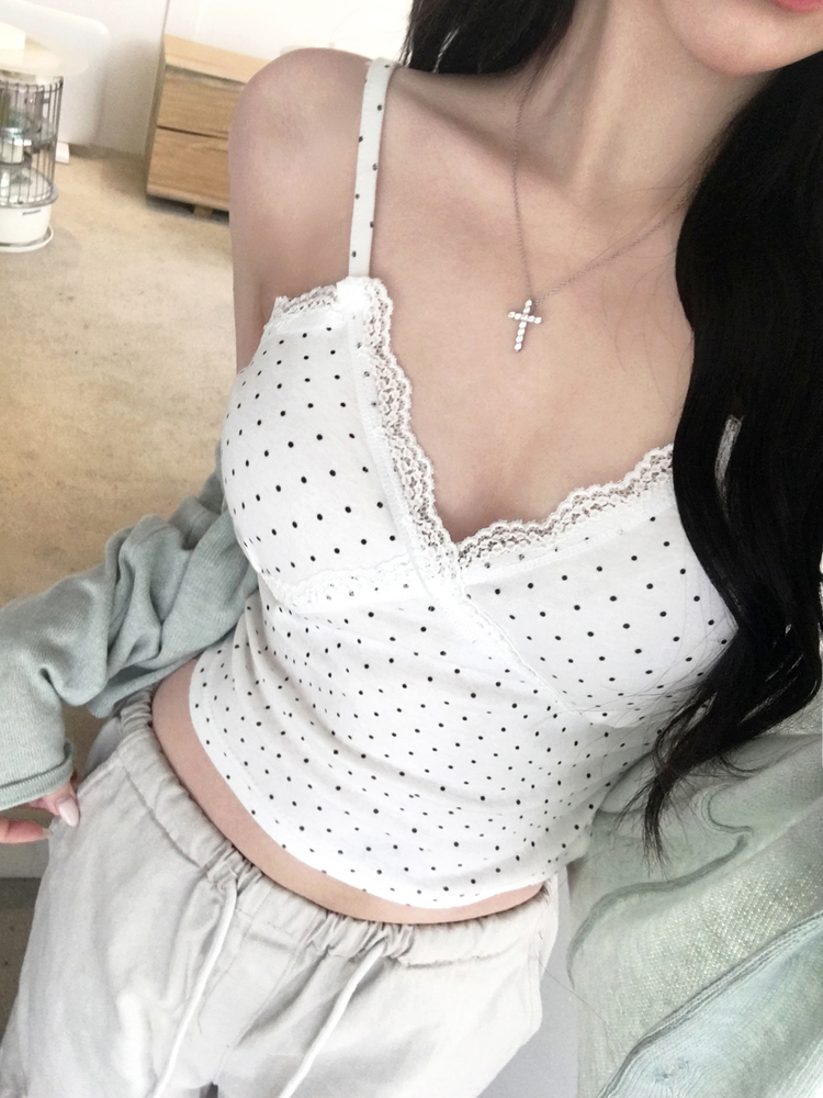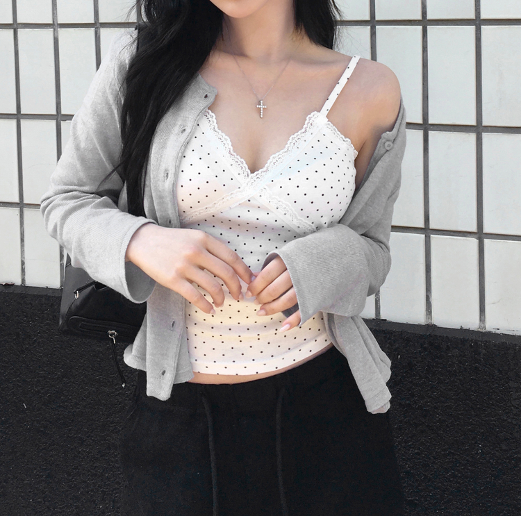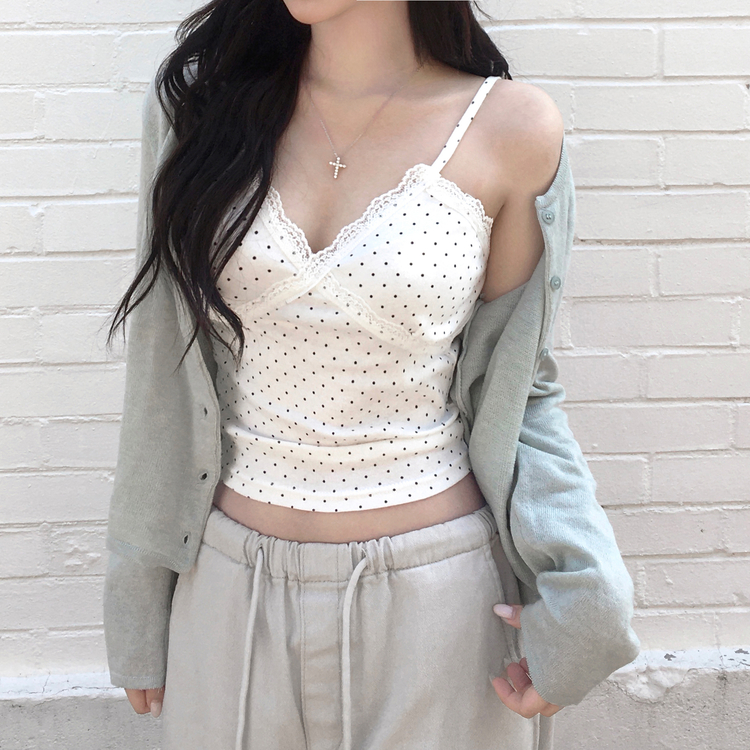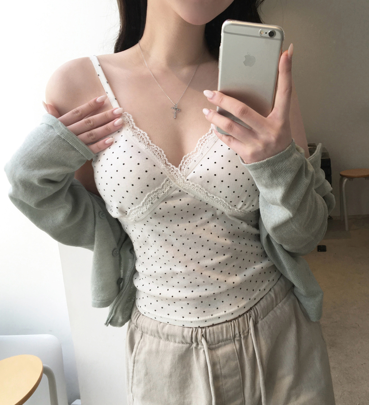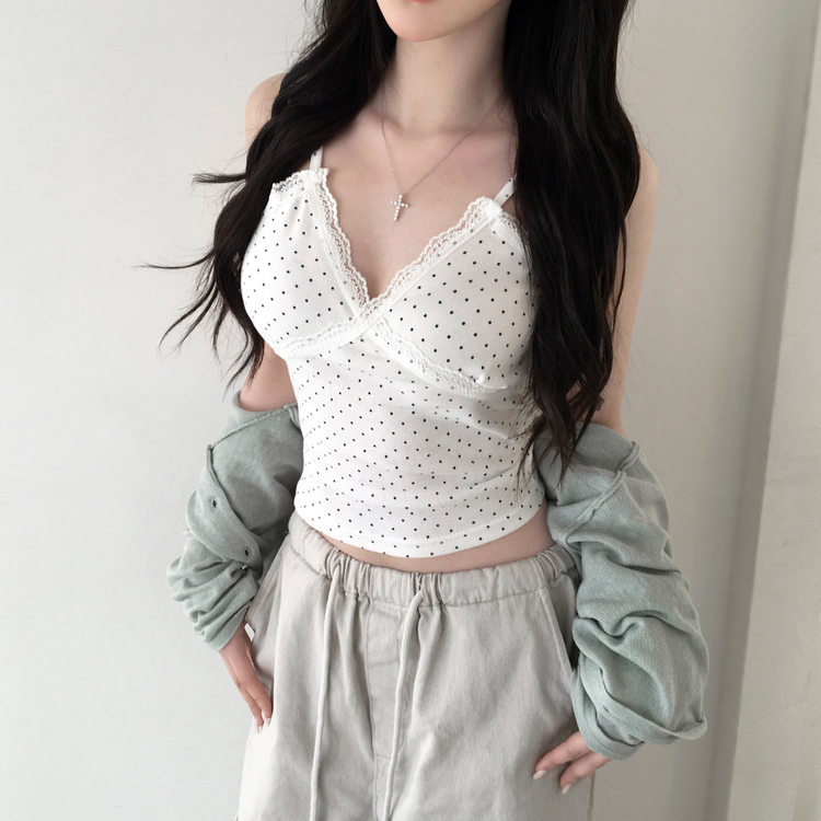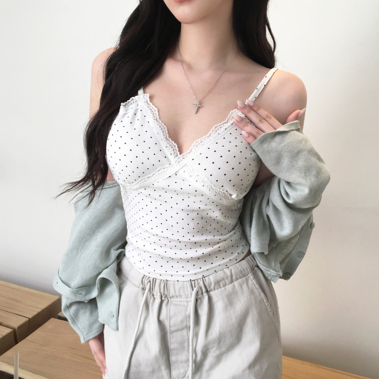 STS244571 루픽 도트 나시 레이스 브이넥 크롭 민소매 끈나시 슬리브리스 레이어드템 러블리룩 데이트룩 데일리룩 여친룩 봄 신상봄 나시사계절템