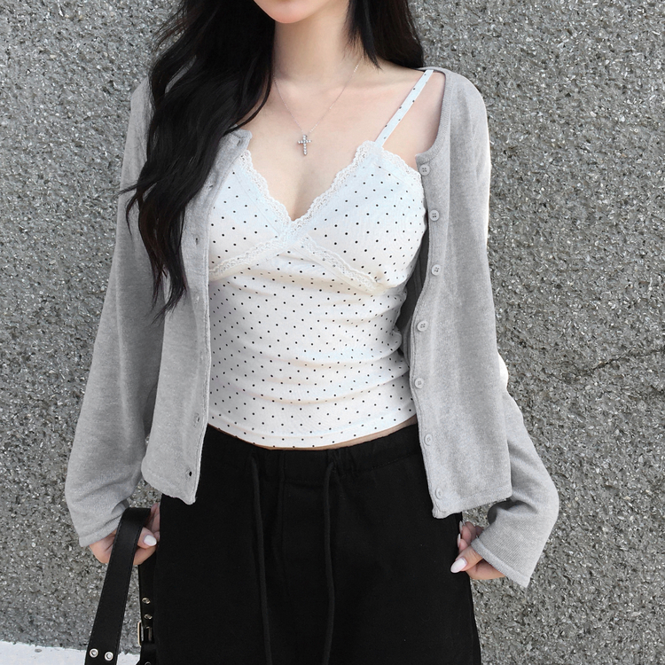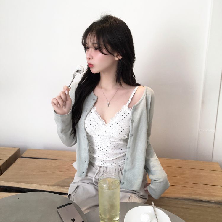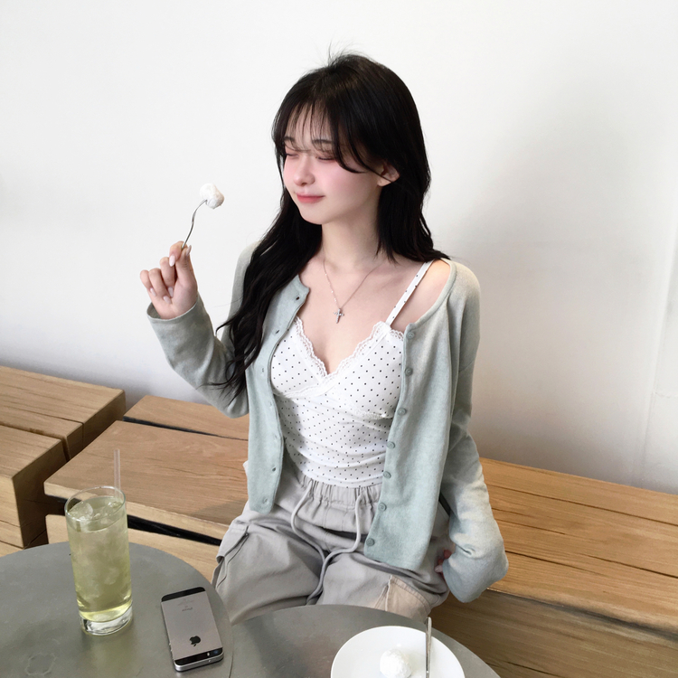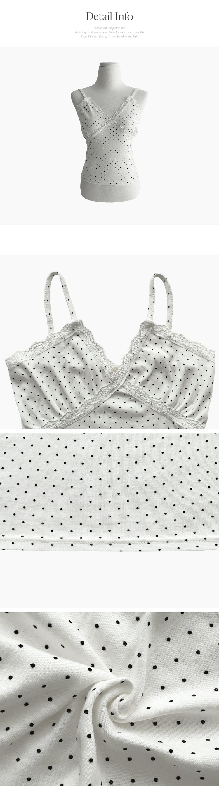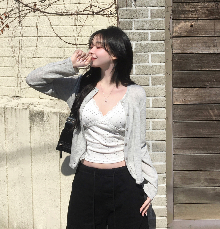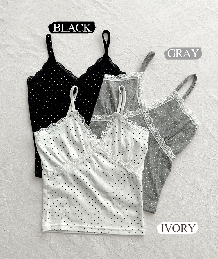 STS244571 루픽 도트 나시 레이스 브이넥 크롭 민소매 끈나시 슬리브리스 레이어드템 러블리룩 데이트룩 데일리룩 여친룩 봄 신상봄 나시사계절템
