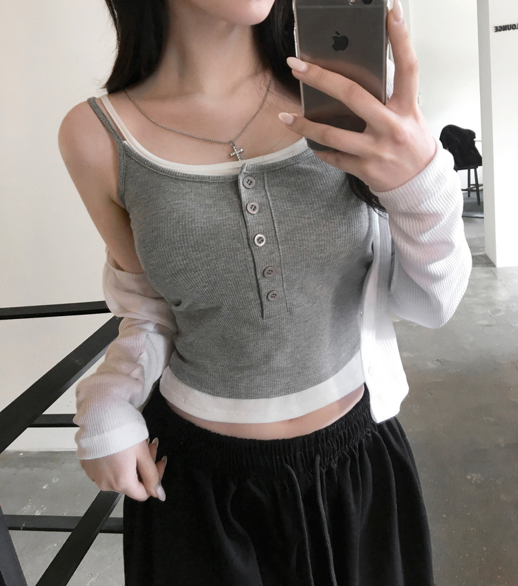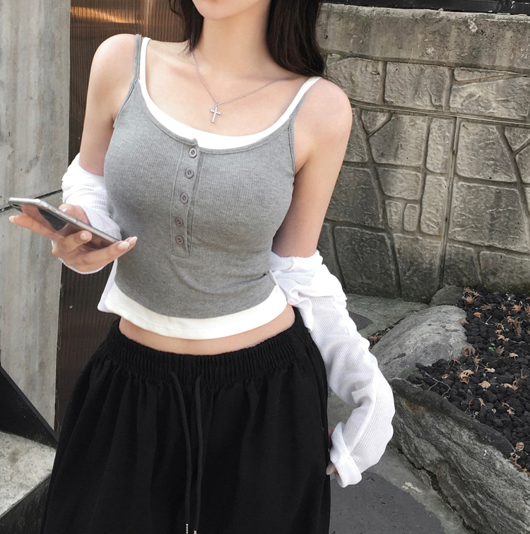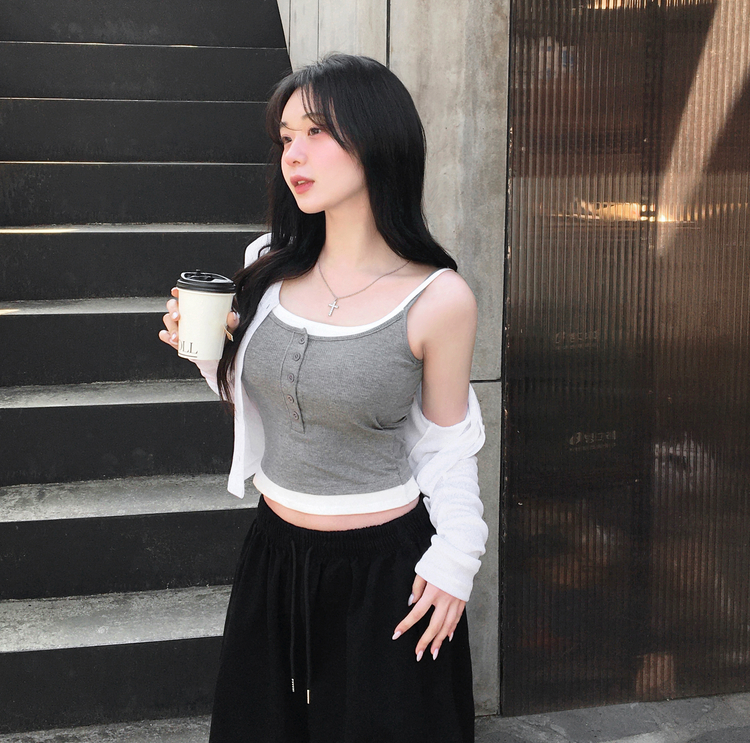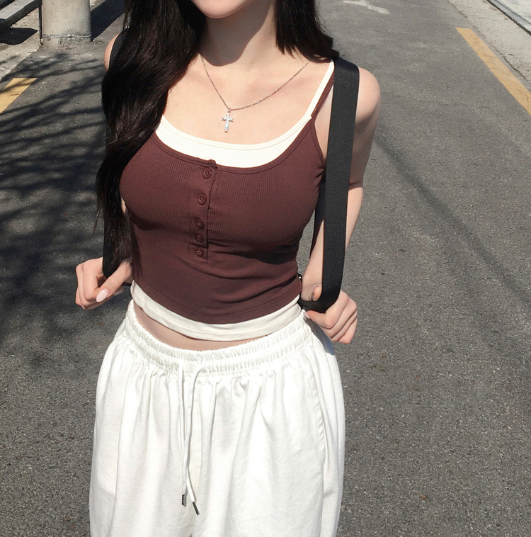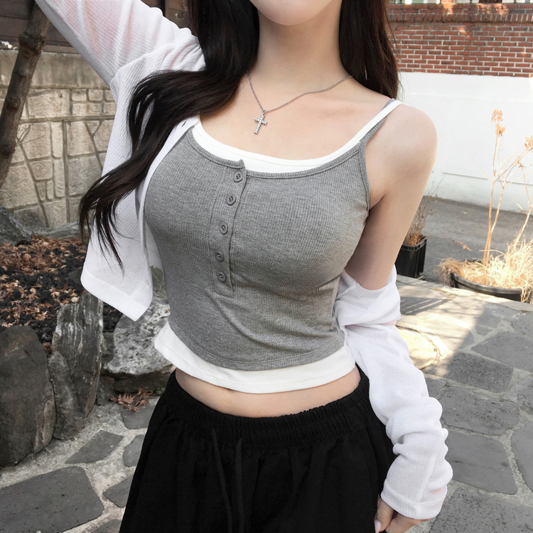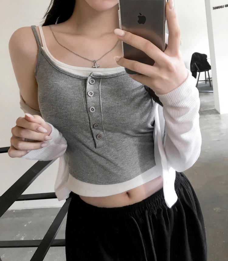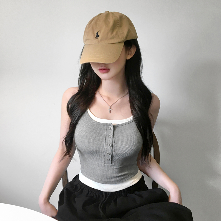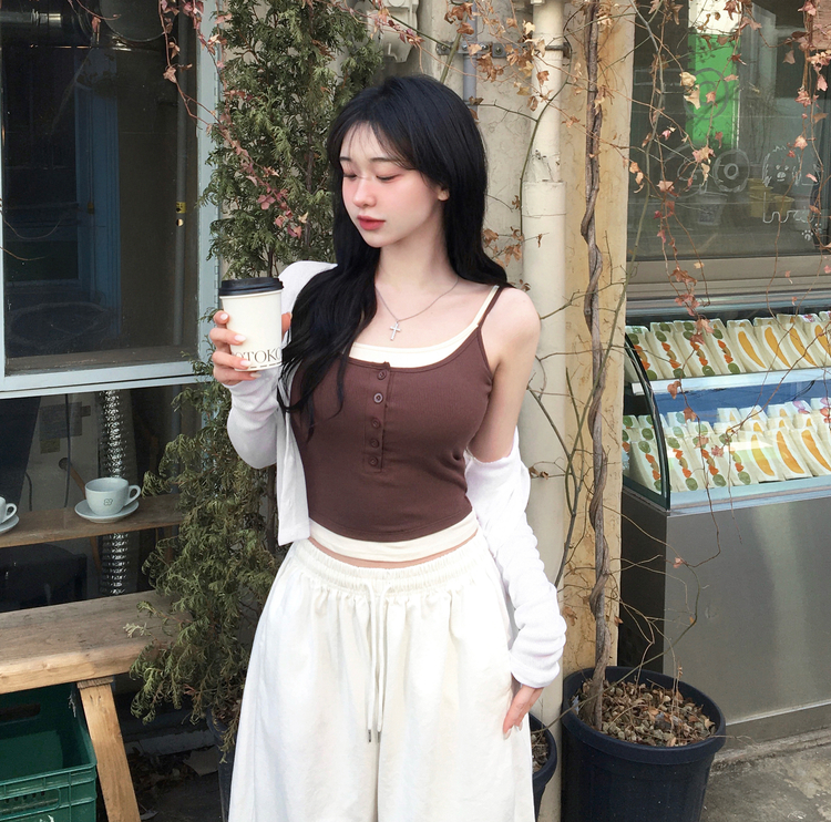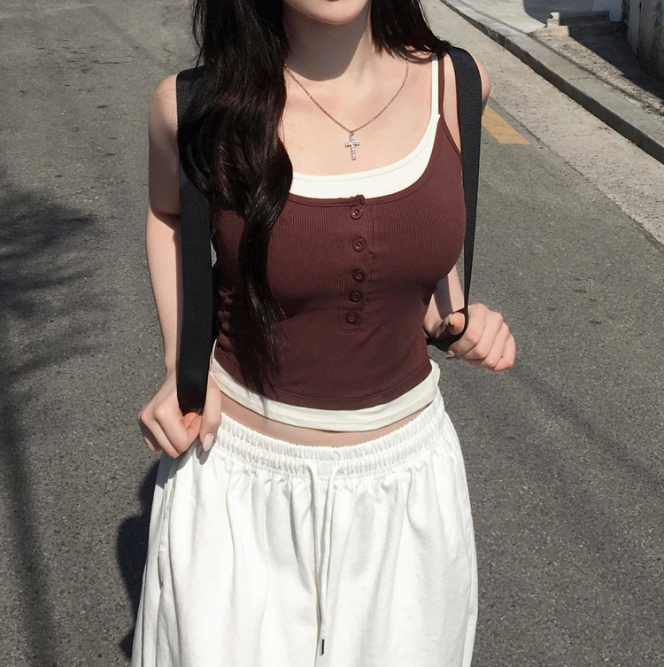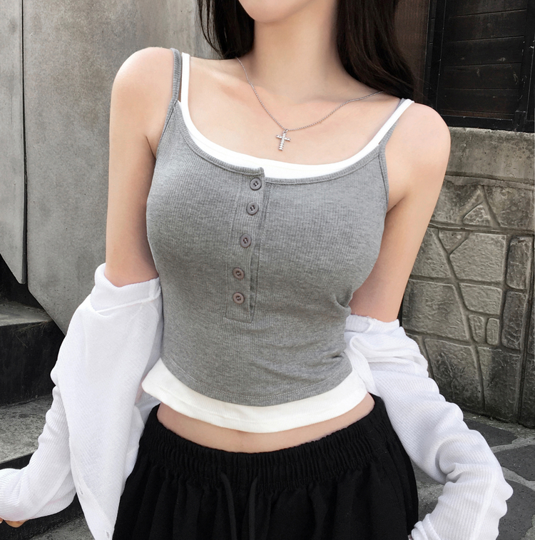 STS244554 케이즈 단추 일체형 캡나시 민소매 슬리브리스 끈나시 골지 슬림핏 허리잘록핏 레이어드 캐주얼 데일리 봄신상봄나시