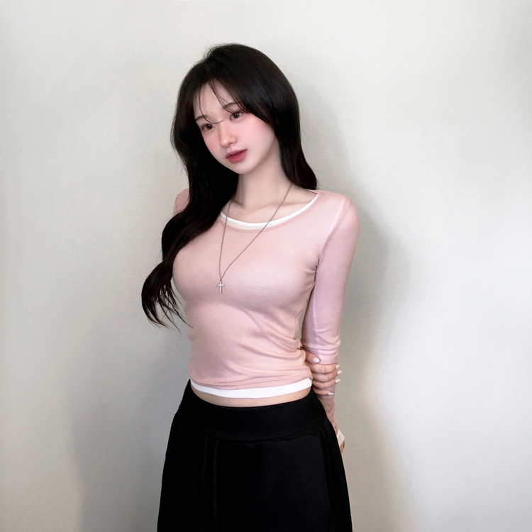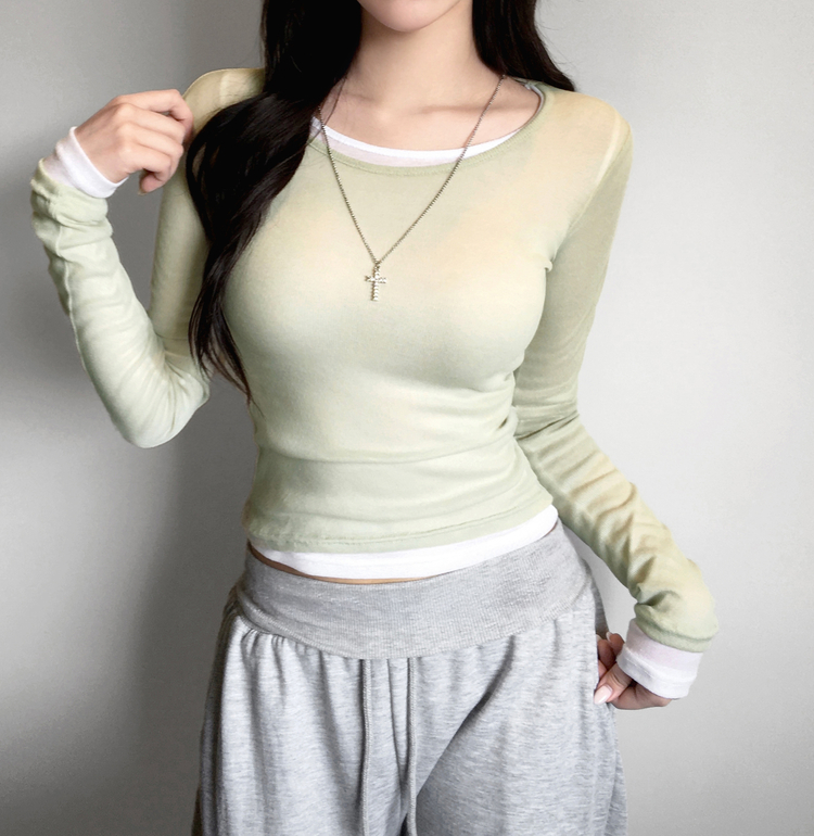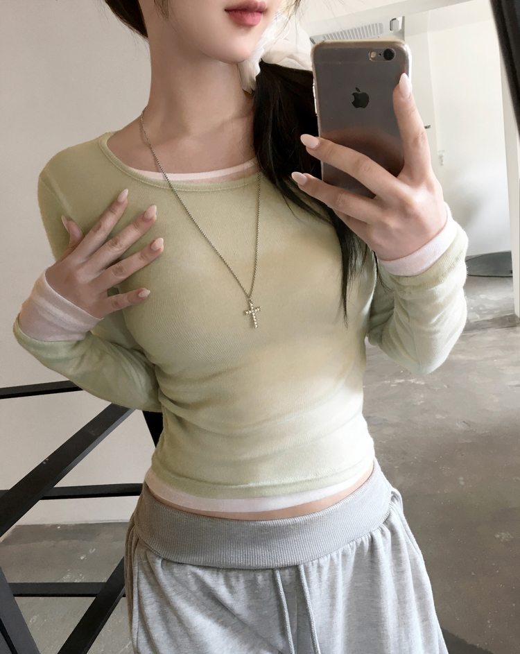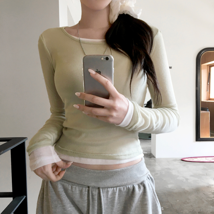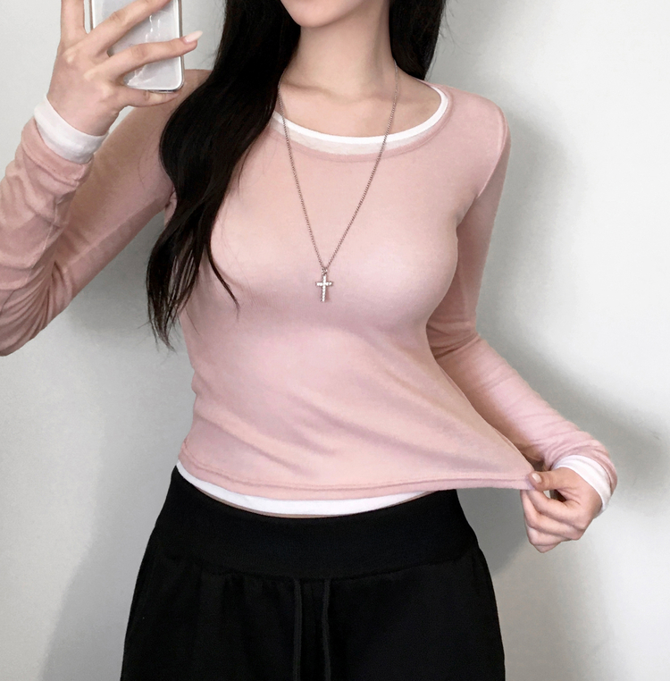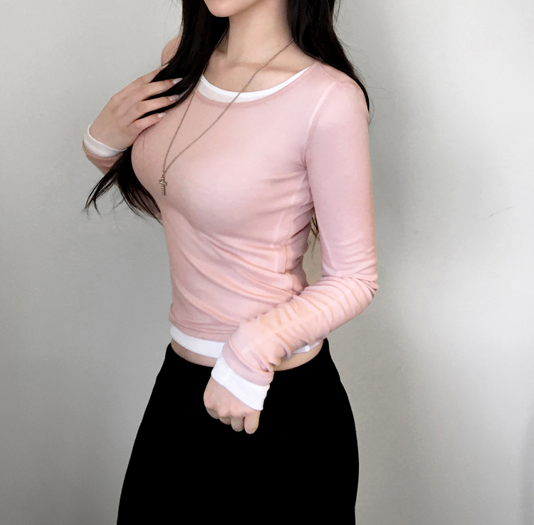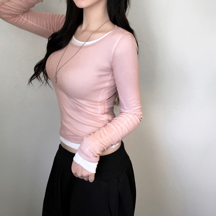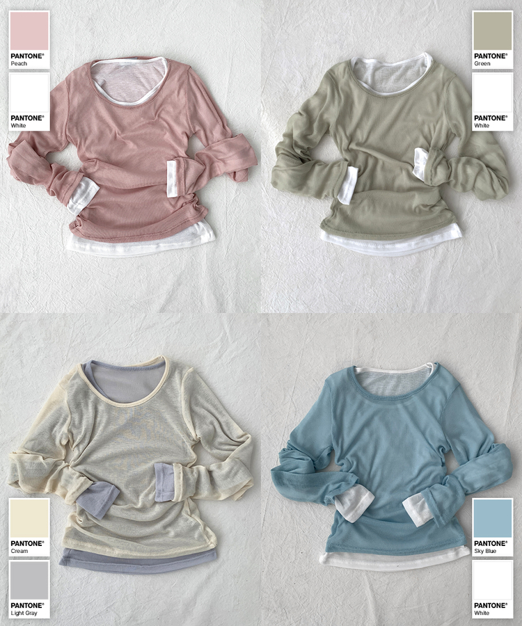 STS244663 멀로즈 시스루 레이어드 티셔츠 긴팔 라운드 쫀쫀 파스텔 슬림핏 러블리 데일리룩 포인트템 봄신상봄레이어드봄컬러