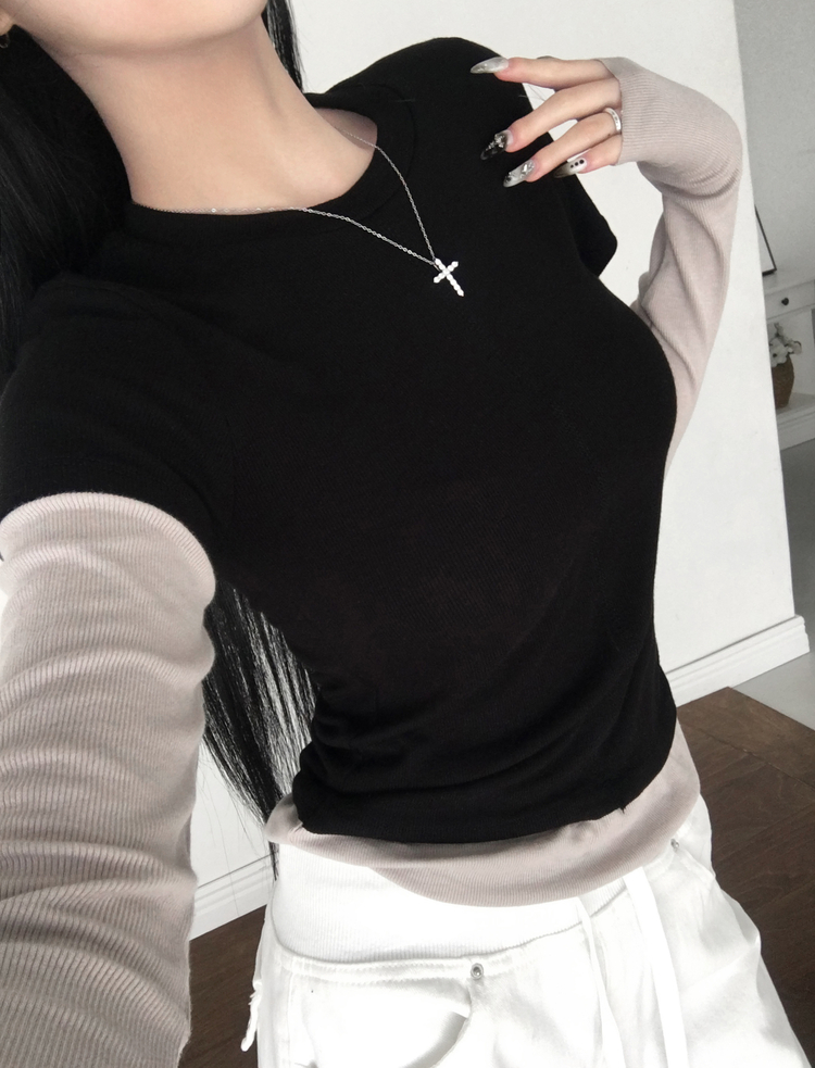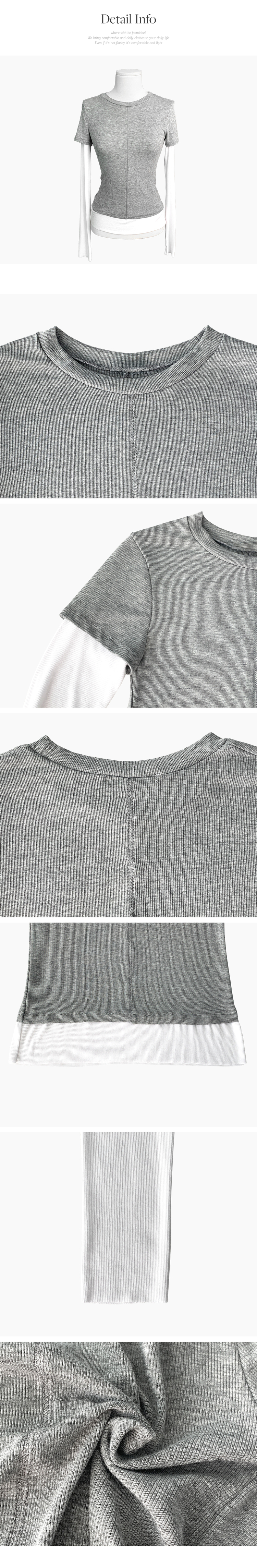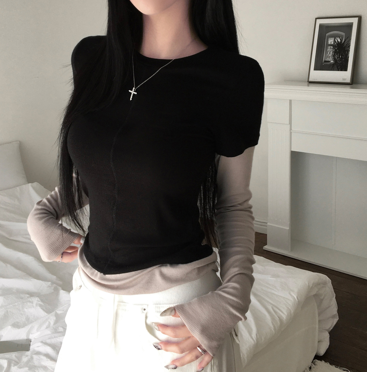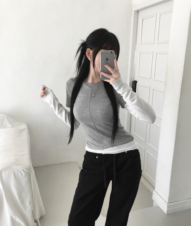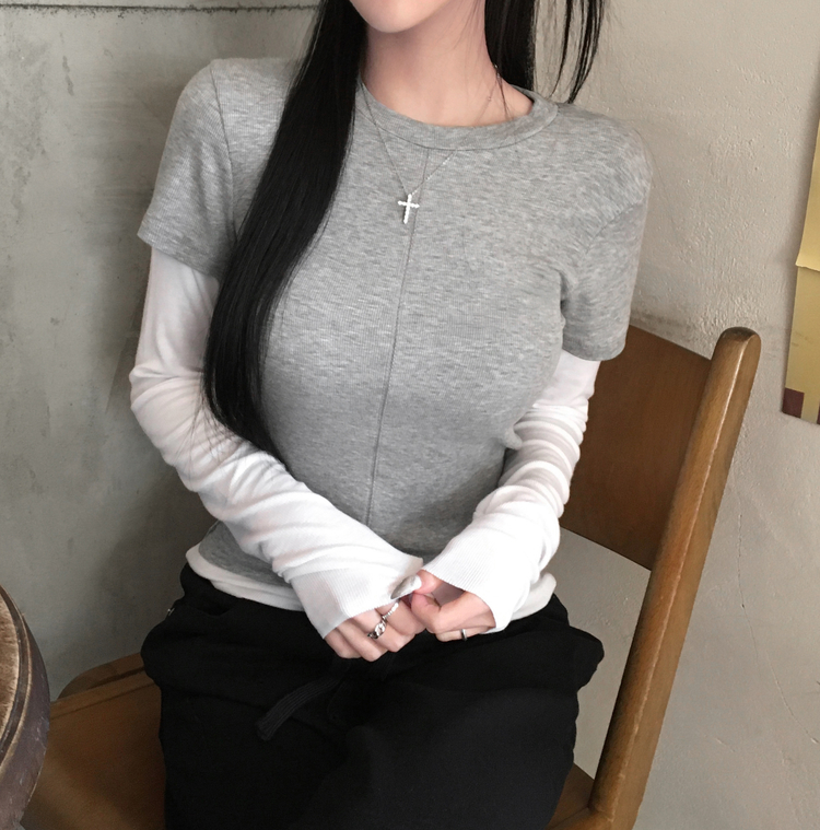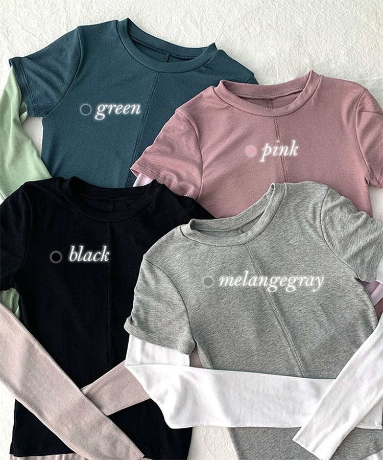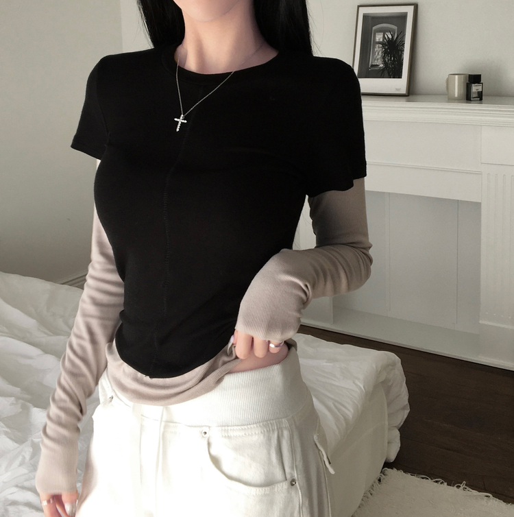 STS244643 [일체형/레이어드] 리쥬 레이어드 배색 티셔츠 라운드넥 슬림핏 스판 긴팔 반팔 세트 일체형 롱슬리브 유니크 데일리룩 봄 신상/봄 티셔츠