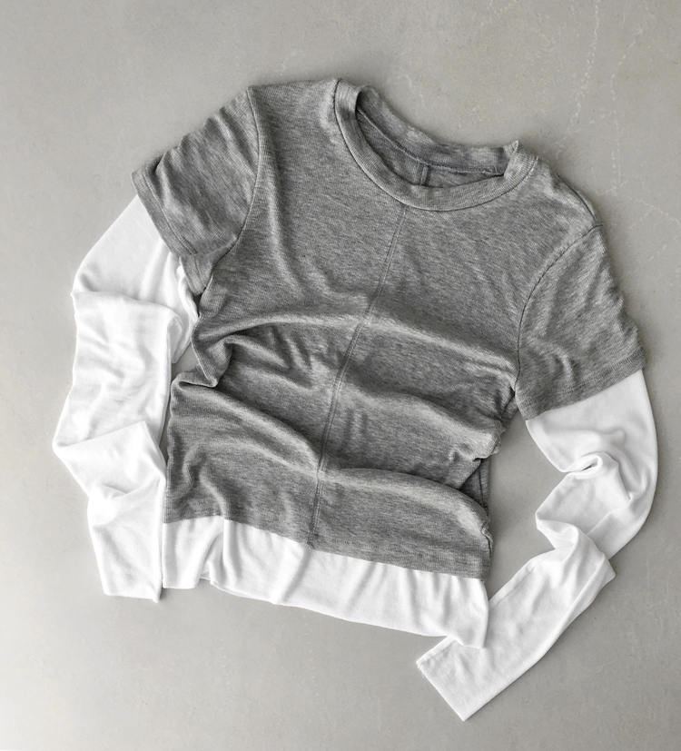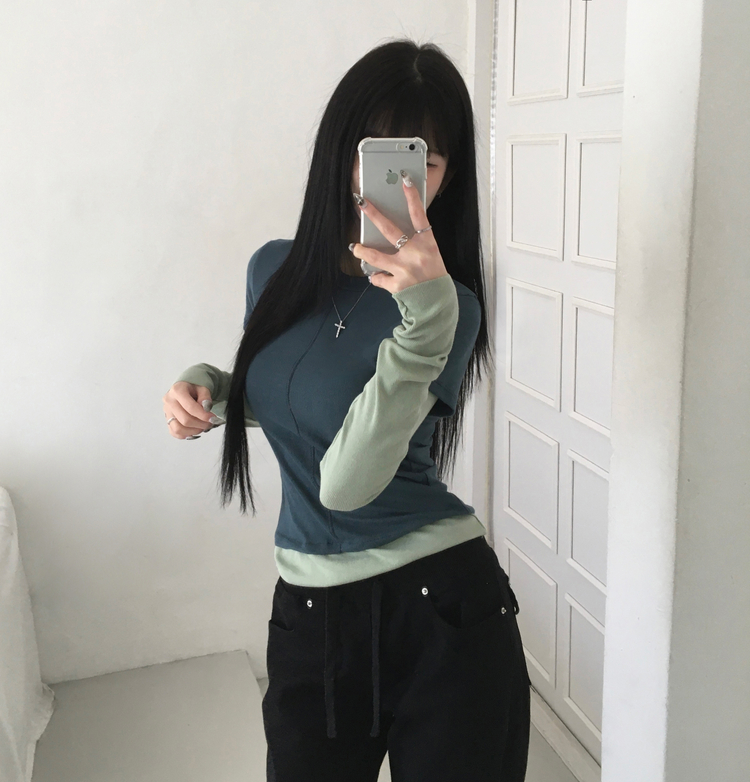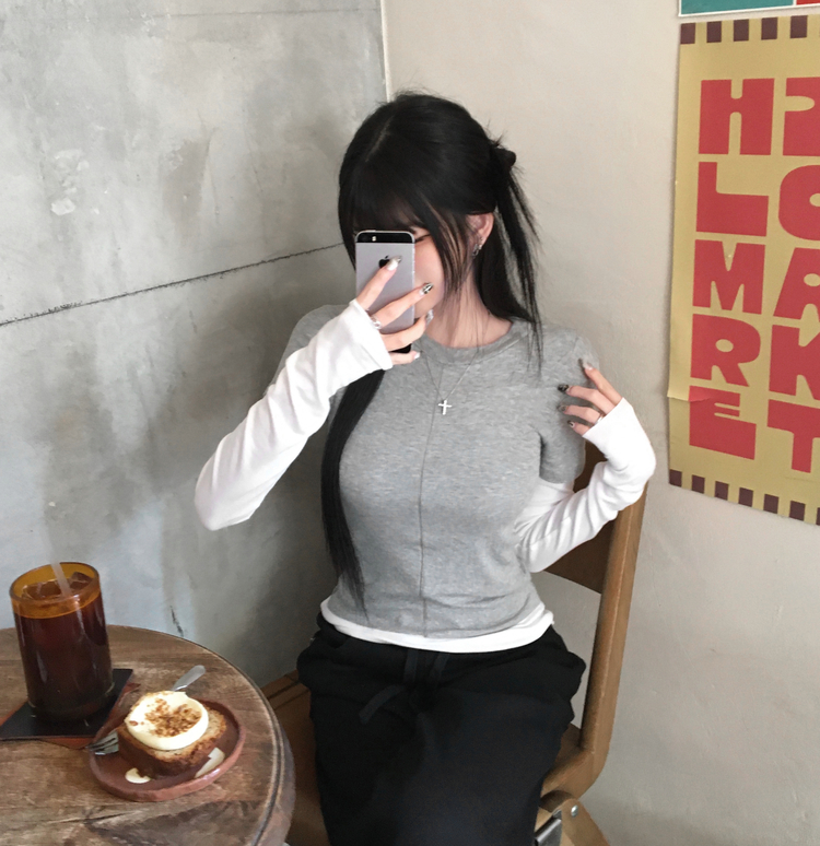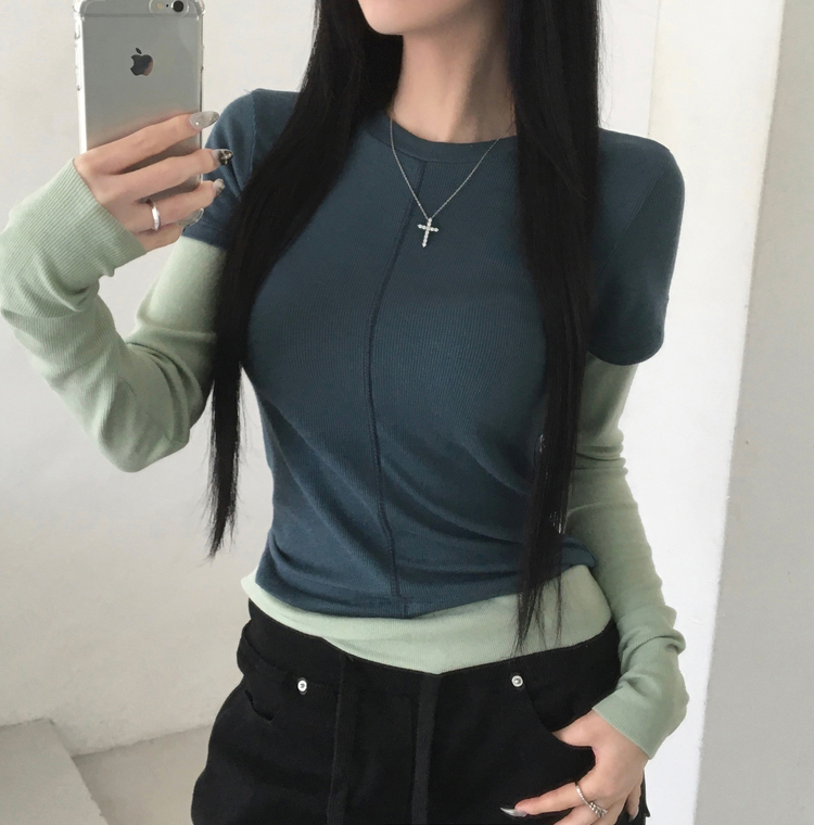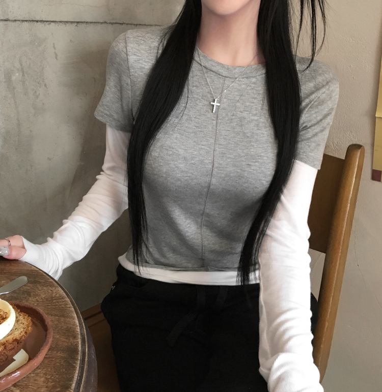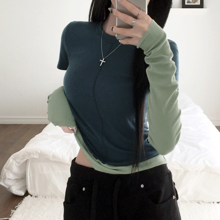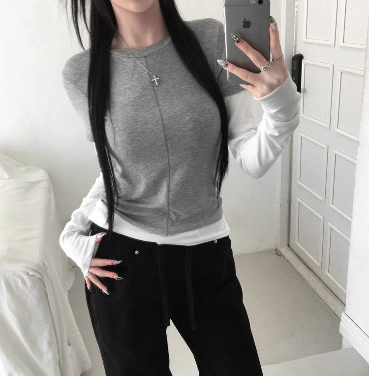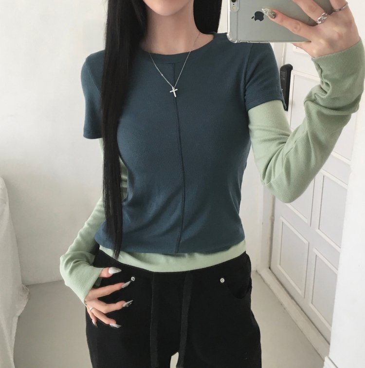 STS244643 [일체형/레이어드] 리쥬 레이어드 배색 티셔츠 라운드넥 슬림핏 스판 긴팔 반팔 세트 일체형 롱슬리브 유니크 데일리룩 봄 신상/봄 티셔츠