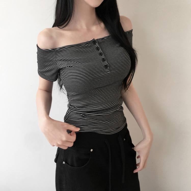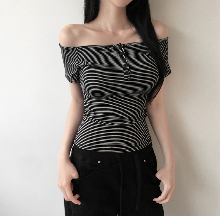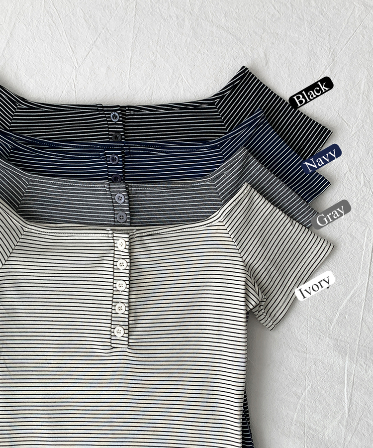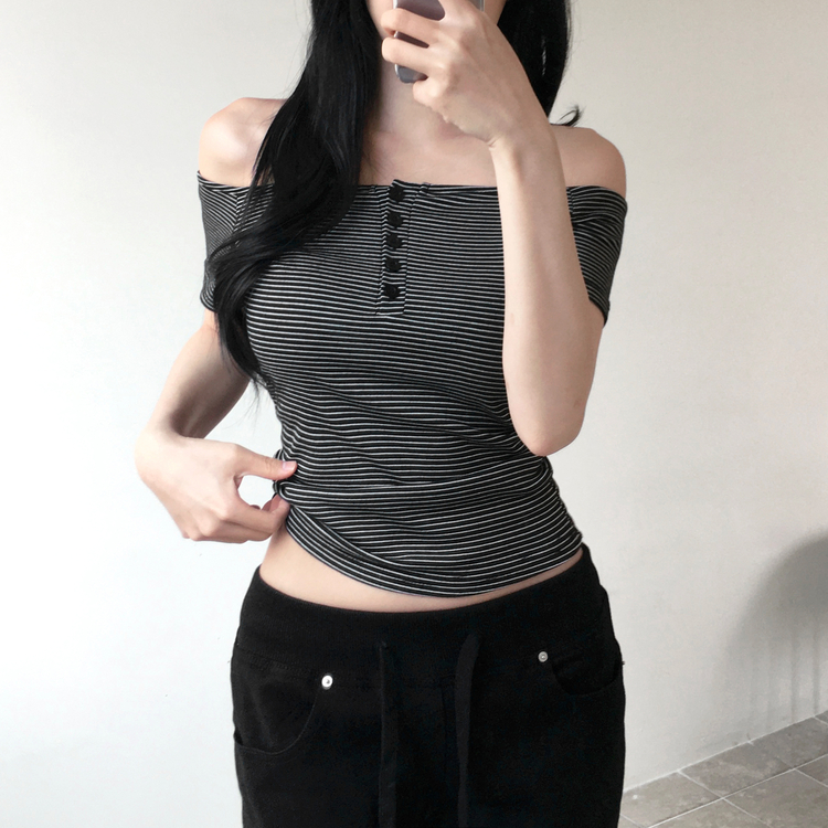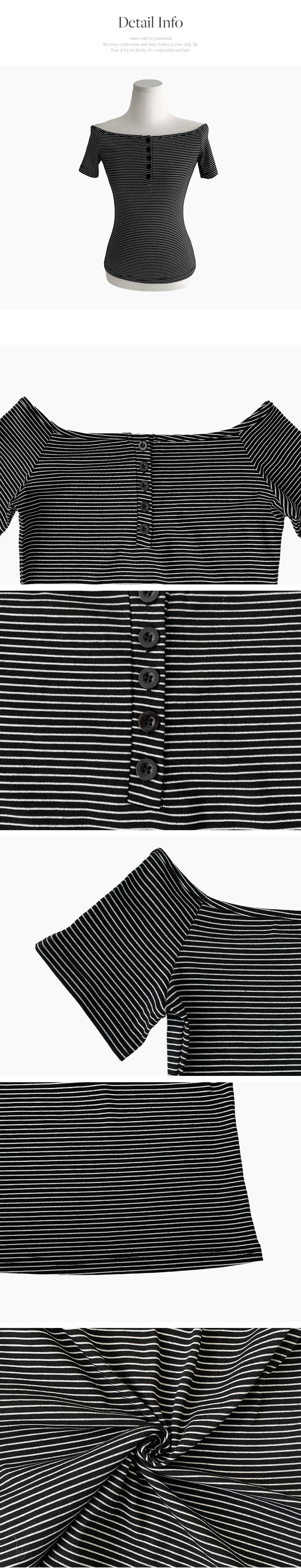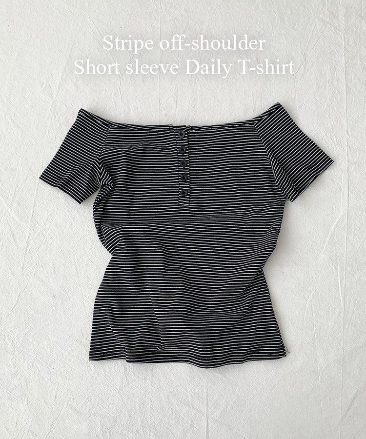 STS244662 아노 단가라 오프숄더 반팔 티셔츠 스트라이프 버튼 포인트 크롭티 캐주얼 데일리룩 데이트룩 봄 신상여름 신상