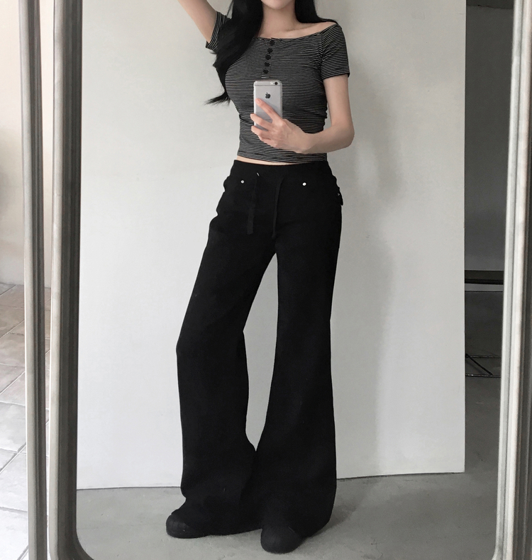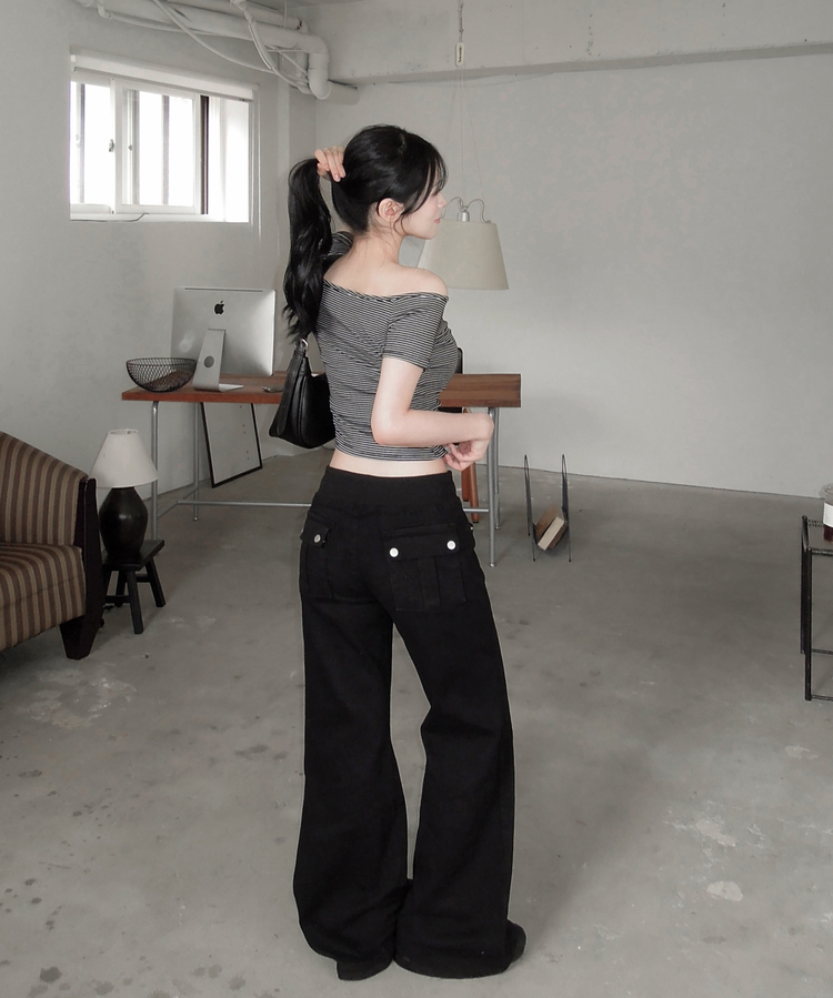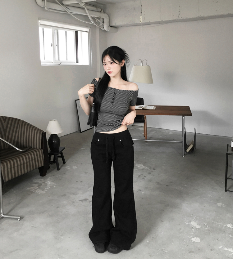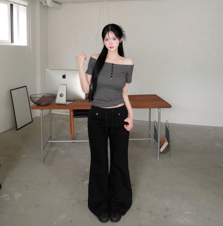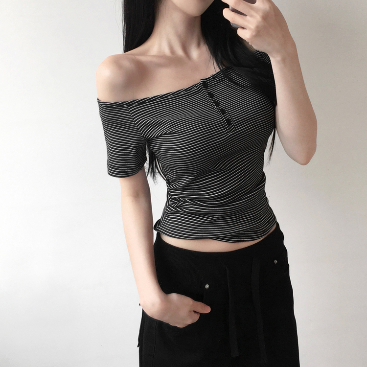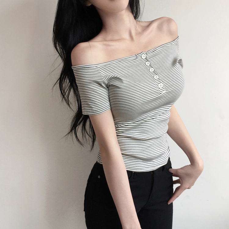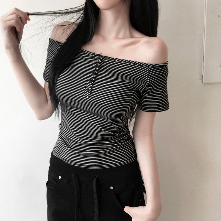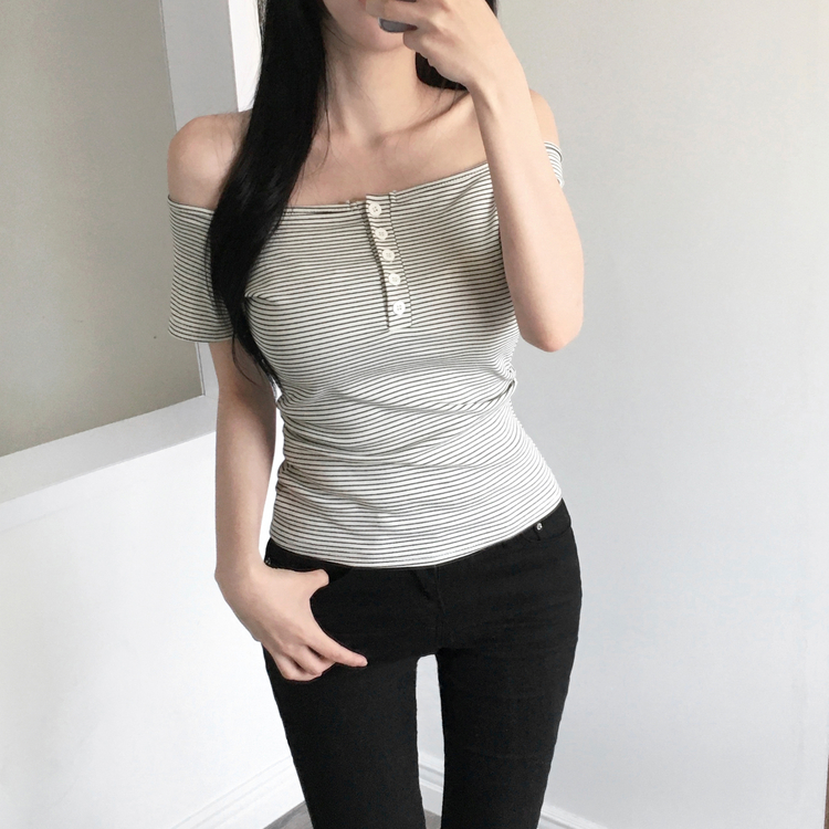 STS244662 아노 단가라 오프숄더 반팔 티셔츠 스트라이프 버튼 포인트 크롭티 캐주얼 데일리룩 데이트룩 봄 신상여름 신상