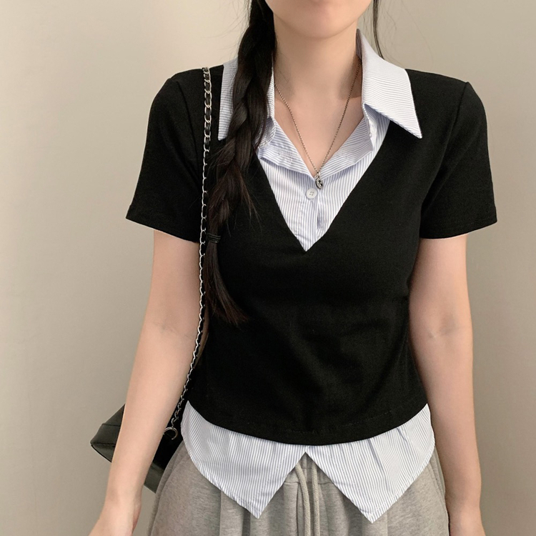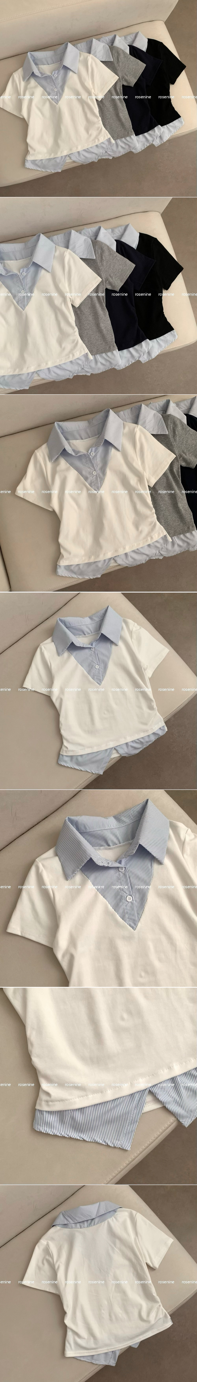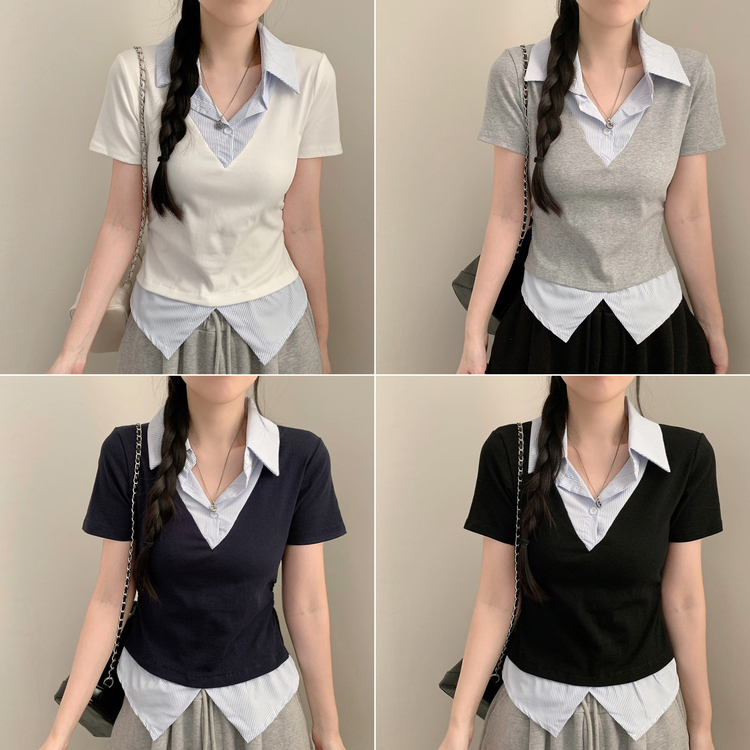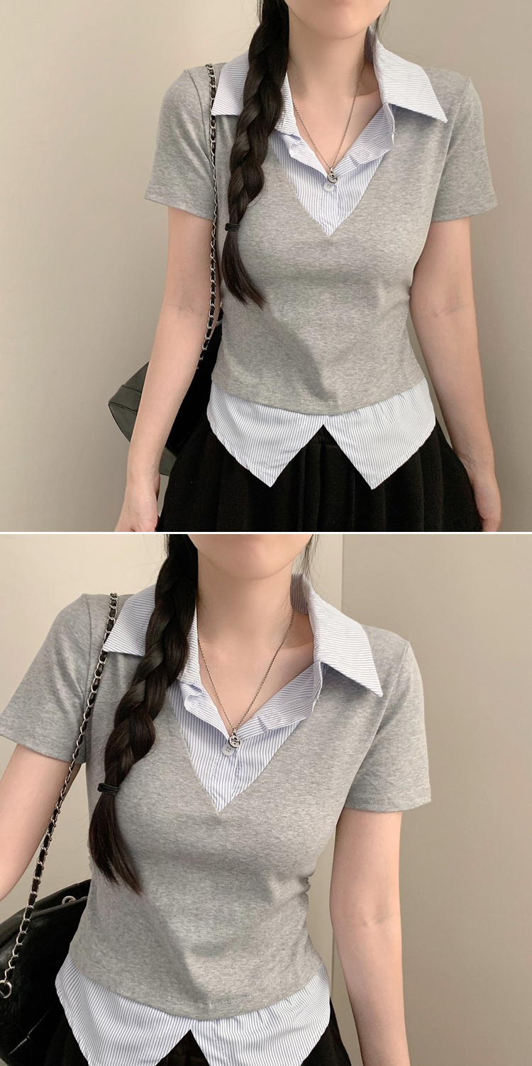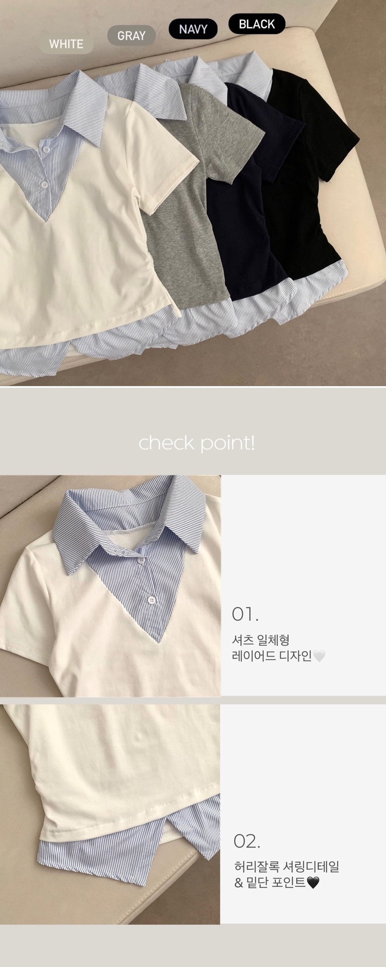 STS244806 잘록핏 스트라이프 셔츠 레이어드 슬림핏 셔링 반팔티 반팔 반소매티셔츠 여름 여름옷 하객룩